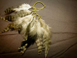 Completely handcrafted from gold-plated copper wire and natural feathers, this beautiful earcuff includes two gold-plated chain across the ear. The feathers measure from 5-7 inches.