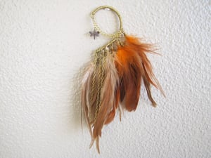 Completely handcrafted from gold-plated copper wire and natural feathers, this beautiful earcuff includes two gold-plated chain across the ear. The feathers measure from 5-7 inches.